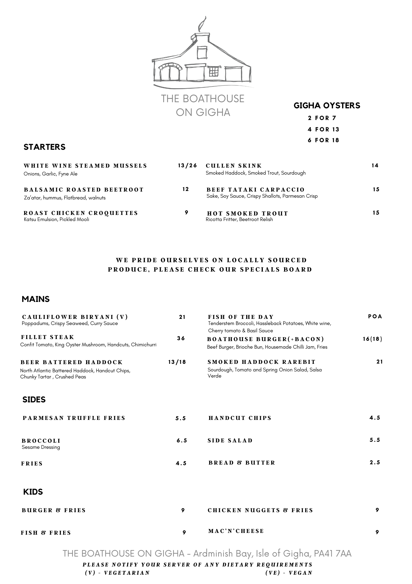 We have a daily ‘Fresh In’ board with our special seafood dishes, meat dishes and vegetarian/vegan options so there is something to suit everyone. Please see below an example of what could be on offer on our 'Fresh In' board. We have a lovely wine list & cocktail menu to pair along side our dishes.